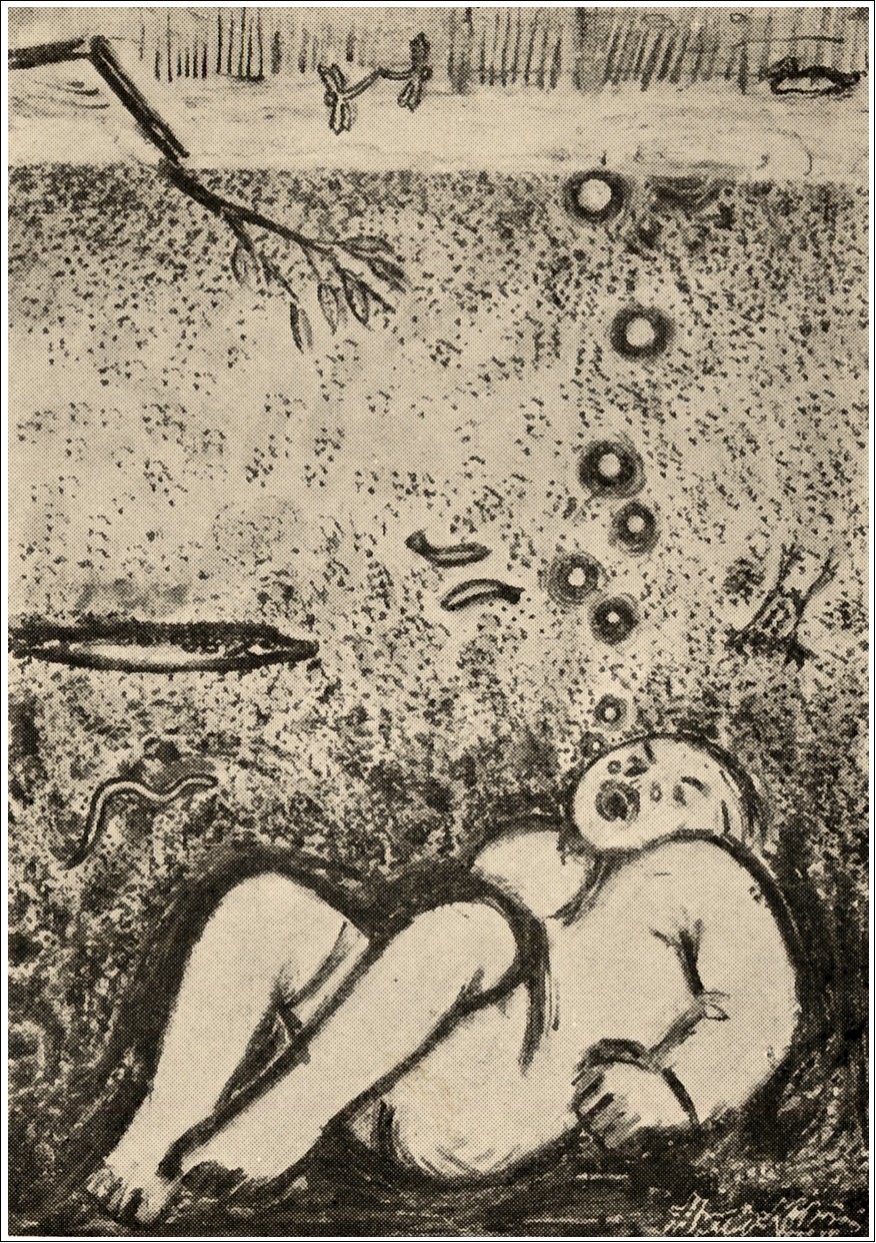 En novelle af svensk-danske forfatter Nils Nilsson (1897-1980) fra novellesamlingen Jord og Skæbner, med illustration af Søren Hjort-Nielsen, 1934.